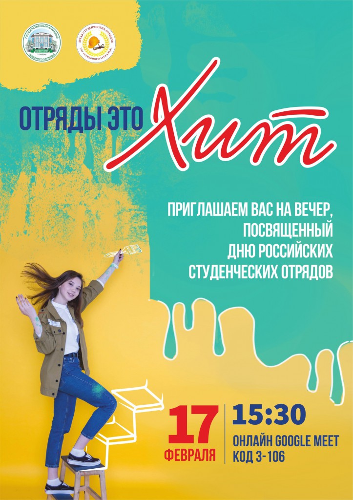 В ГАУ Северного Зауралья состоится круглый стол, посвящённый Дню российских студенческих отрядов «Отряды - это Хит». В программе: выставка достижений студенческих отрядов, торжественная часть, доклады, видеопрезентации, награждение.