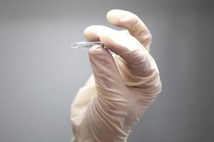 Яна Кабицкая, научный сотрудник лаборатории, берет картофель сорта Hermes и отрезает кусочек. Этот срез помещает в раствор.